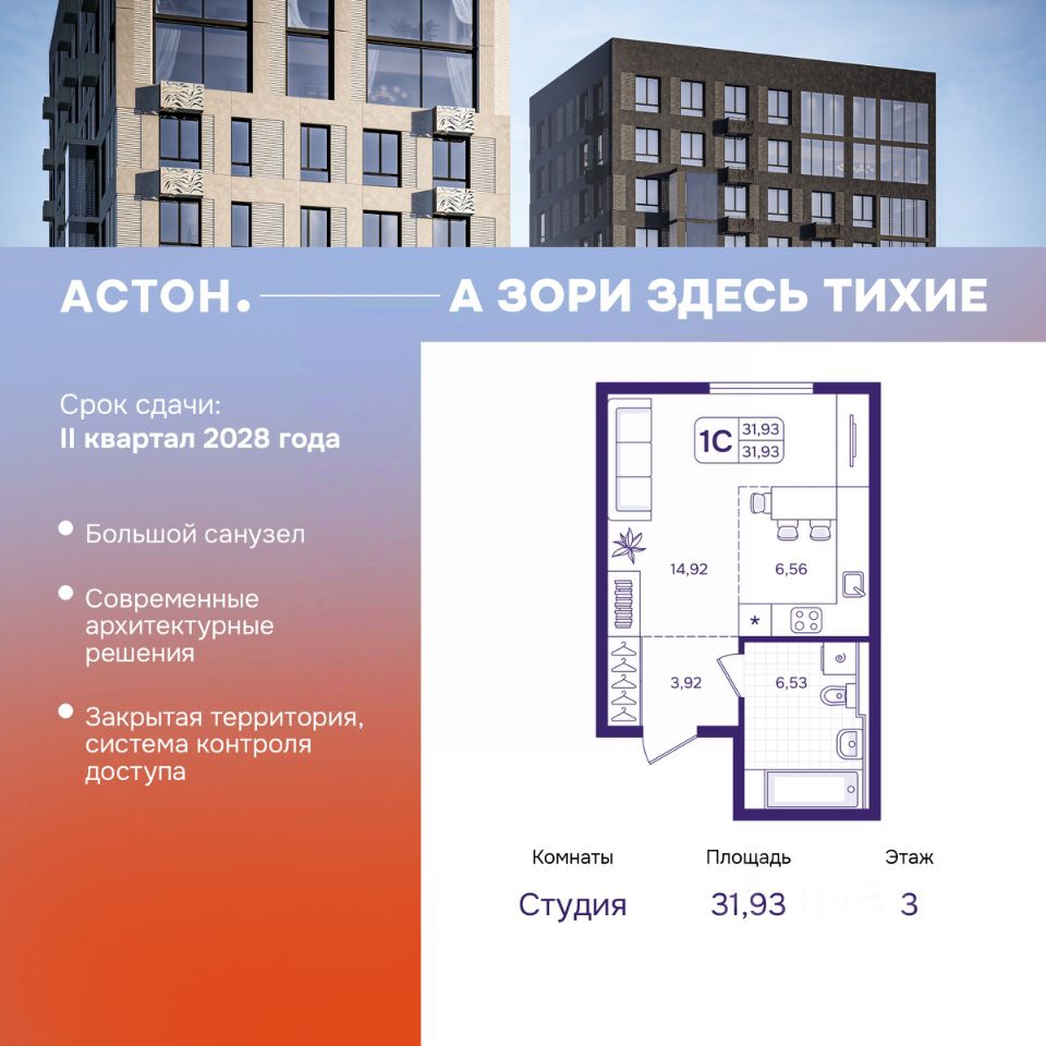 Просторная однокомнатная квартира-студия в ЖК "Астон. А зори здесь тихие" на 3 этаже. Квартира без отделки, полностью готова к чистовой отделке и дальнейшему ремонту. Общая площадь: 31.93 кв.м., площадь гостиной 21.48 кв.м., из которых 6.56 кв.м. выделено под кухонную зону. Все окна выходят на одну сторону. В квартире один совмещенный санузел. Высота потолков 2.87 м.