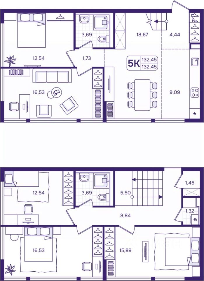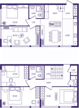 Продается 5-комн. квартира от застройщика в ЖК "Астон. А зори здесь тихие" на 16 этаже. Квартира без отделки, полностью готова к ремонту. Двухуровневая квартира, множество вариантов распределения полезного пространства. Общая площадь: 132.45 кв.м., жилая: 73.89 кв.м., площадь просторной кухни-столовой: 27.76 кв.м. Квартира угловая, очень светлая, естественная вентиляция при открытии окон. В квартире два совмещенных санузла. Высота потолков 2.87 м.