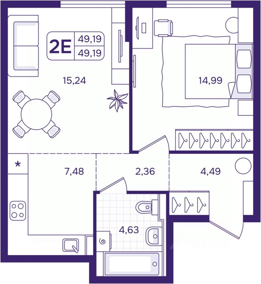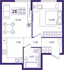 1-комн. квартира с предчистовой отделкой в ЖК "Астон. А зори здесь тихие" на 2 этаже. Общая площадь: 49.19 кв.м., жилая: 14.99 кв.м., площадь просторной кухни-столовой: 22.72 кв.м. Все окна выходят на одну сторону. В квартире один совмещенный санузел. Высота потолков 2.87 м.