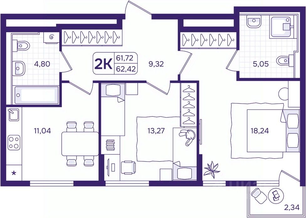 2-комн. квартира в ЖК "Астон. А зори здесь тихие" на 8 этаже. Квартира без отделки, полностью готова к ремонту. Общая площадь: 62.42 кв.м., жилая: 31.51 кв.м., площадь просторной кухни-столовой: 11.04 кв.м. Комнаты изолированные, все окна выходят на одну сторону. В квартире один балкон, два совмещенных санузла. Высота потолков 2.87 м.