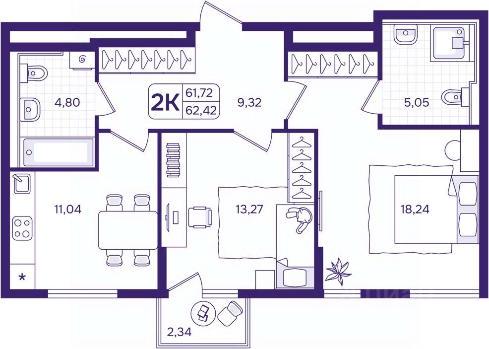 2-комн. квартира от застройщика в ЖК "Астон. А зори здесь тихие" на 11 этаже. Квартира без отделки, новый собственник может сделать ремонт по своему проекту. Общая площадь: 62.42 кв.м., жилая: 31.51 кв.м., площадь просторной кухни-столовой: 11.04 кв.м. Комнаты изолированные, все окна выходят на одну сторону. В квартире один балкон, два совмещенных санузла. Высота потолков 2.87 м.