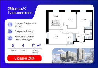 Продается 3-комн. квартира на 4-м этаже в жилом комплексе GloraX Тухачевского — современном проекте нового формата в престижном районе Владивостока. Общая площадь лота составляет 71,12 кв. м, из которых 38,45 кв. м отведено под жилую и 14,66 кв. м под кухонную зону. Номер квартиры - 31. Преимущества квартиры: трехкомнатная квартира; угловая; 2 санузла. Преимущества проекта: • Панорамный вид на Амурский залив и зелёные сопки • Удачное расположение и транспортная доступность: Первореченский район, 20 минут до центра города • Закрытая охраняемая территория с доступом только для жителей • Эксклюзивное благоустройство: продуманное зонирование, игровые и спортивные площадки, арт-инсталляция, Тайный сад • Безбарьерная среда, видеонаблюдений, Wi-Fi на территории • Премиальный дизайн входных групп реcепшн и лаунж-зоной • Лапомойки, колясочные и туалеты на первом этаже • Подземный паркинг на 449 машиномест с доступом на лифте с жилых этажей • Индивидуальные кладовые на цокольном этаже от 2 до 10 м2 GloraX Тухачевского — это городское пространство нового формата, которое позволяет современным горожанам находить все необходимые атрибуты комфортной жизни внутри своего жилого комплекса. Весь комплекс спроектирован так, чтобы жить здесь было удобно и безопасно: светлые лаунж-зоны и ресепшн на входах в жилые корпуса, эксклюзивный дизайн мест общего пользования и придомовой территории, круглосуточная охрана, видеонаблюдение и даже детский сад в одном из корпусов все, что необходимо современному городскому жителю. GloraX Тухачевского находится в одном из самых престижных районов города с хорошей, давно сформировавшейся инфраструктурой и отличной транспортной доступностью. Отсюда легко добраться до центра города, других районов и даже пригорода как на собственном транспорте, так и на общественном. Квартал имеет прямой выезд на ул. Тухачевского, а рядом с комплексом расположена автобусная остановка на несколько маршрутов. Проект состоит из 3 монолитных корпусов, объединенных единым стилобатом. В комплексе предусмотрены: подземный паркинг с лифтом на жилые этажи, кладовые для хранения, благоустроенный двор без машин, детские и спортивные площадки, зоны для отдыха и прогулок. Эксклюзивный проект благоустройства территории разработан одной из лучших студий ландшафтного дизайна DEREVOPARK с фокусом на комфорт и удобство для всех жителей комплекса. Вся необходимая инфраструктура — магазины, школы, детские сады, остановки общественного транспорта — находится рядом. Узнайте подробности и подберите свою квартиру в GloraX Тухачевского — в отделе продаж уже сегодня. Цена указана при 100% оплате или стандартной ипотеке. Узнайте подробности в Отделе продаж.