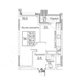 Общая площадь квартиры — 37.9 кв. м, этаж 18 из 23.
