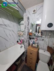 Полы — линолеум, стены — обои, потолок — плитка, санузел совмещенный.