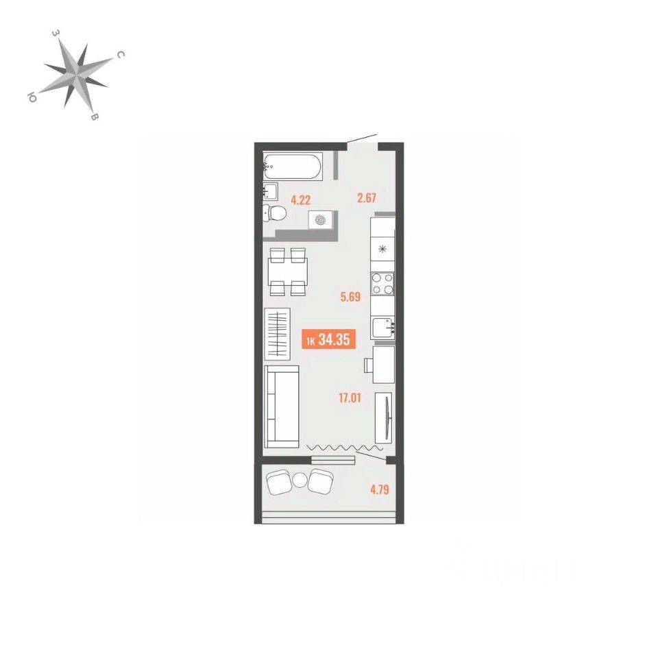 Продаётся 1-комнатная квартира в строящемся доме (Дом 1), срок сдачи: I-кв. 2028, общей площадью 34.35 кв.м., на 10 этаже. Для тех, кто строит будущее Большого Камня