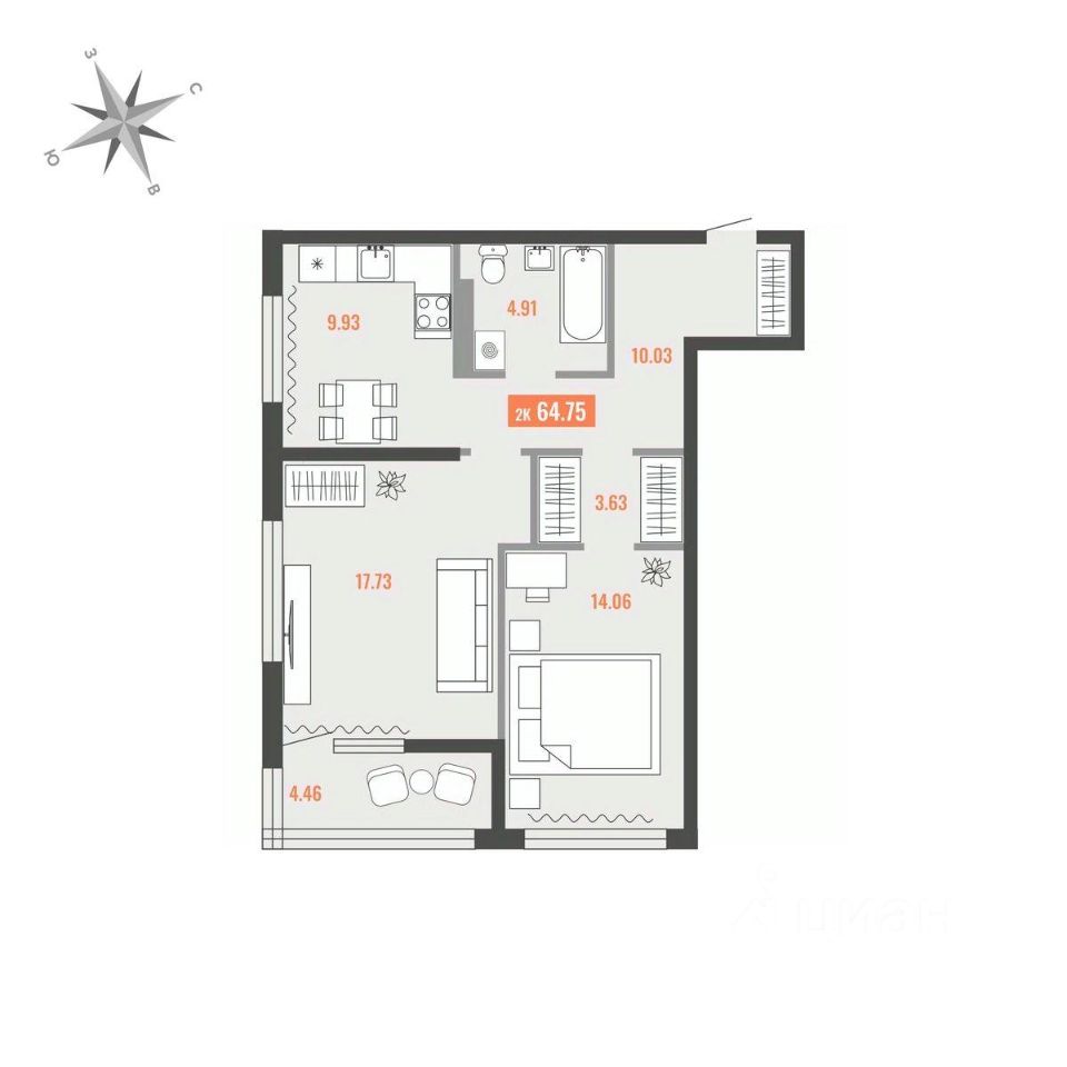 Продаётся 2-комнатная квартира в строящемся доме (Дом 1), срок сдачи: I-кв. 2028, общей площадью 64.75 кв.м., на 10 этаже. Для тех, кто строит будущее Большого Камня