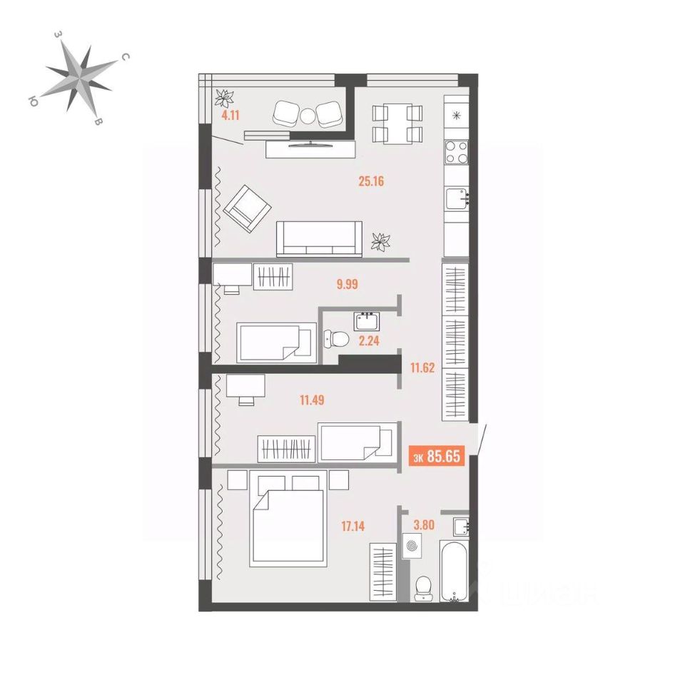 Продаётся 3-комнатная квартира в строящемся доме (Дом 1), срок сдачи: I-кв. 2028, общей площадью 85.65 кв.м., на 10 этаже. Для тех, кто строит будущее Большого Камня