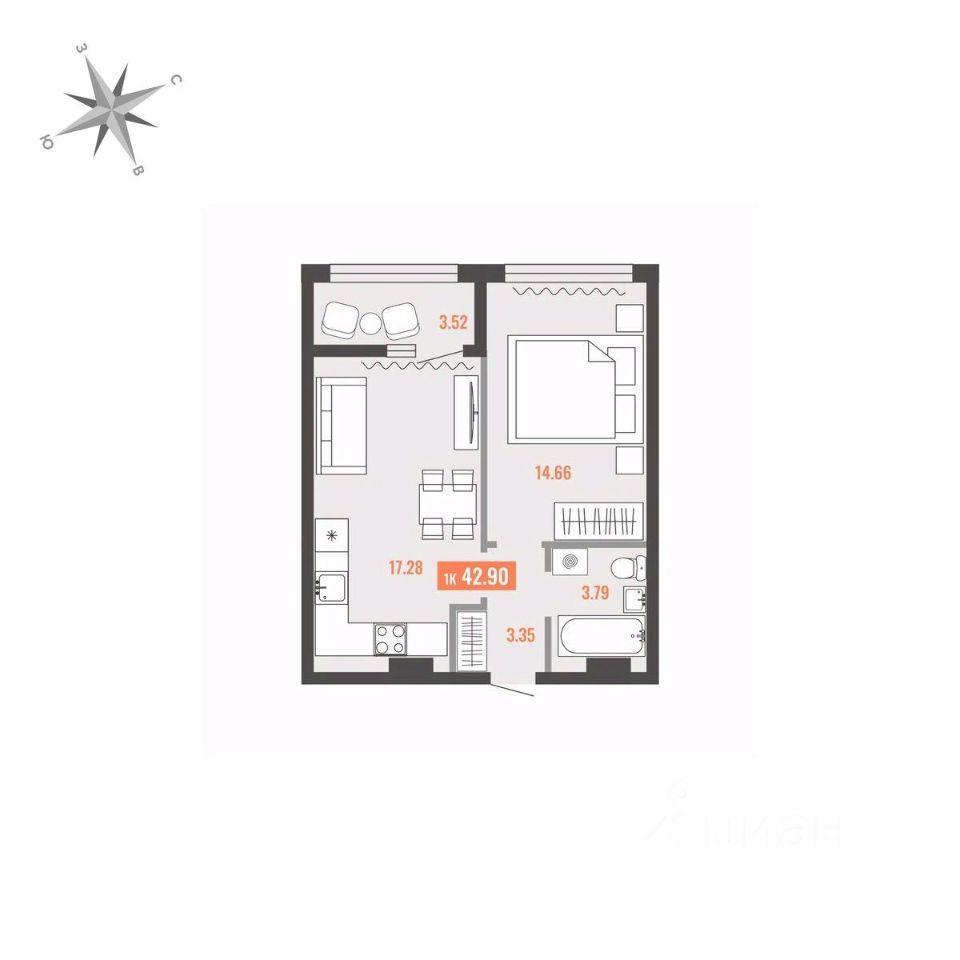 Продаётся 1-комнатная квартира в строящемся доме (Дом 1), срок сдачи: I-кв. 2028, общей площадью 42.9 кв.м., на 10 этаже. Для тех, кто строит будущее Большого Камня