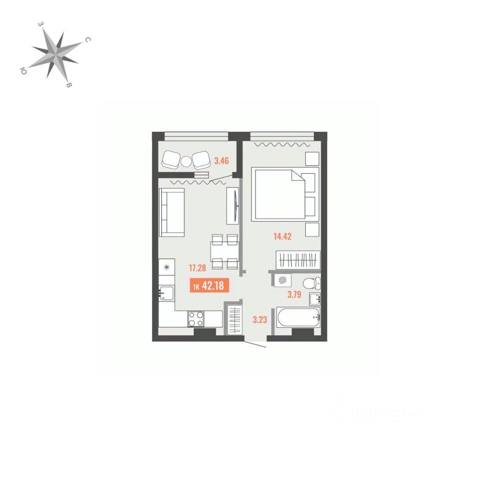 Продаётся 1-комнатная квартира в строящемся доме (Дом 1), срок сдачи: I-кв. 2028, общей площадью 42.18 кв.м., на 11 этаже. Для тех, кто строит будущее Большого Камня