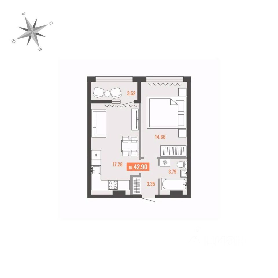 Продаётся 1-комнатная квартира в строящемся доме (Дом 1), срок сдачи: I-кв. 2028, общей площадью 42.9 кв.м., на 11 этаже. Для тех, кто строит будущее Большого Камня
