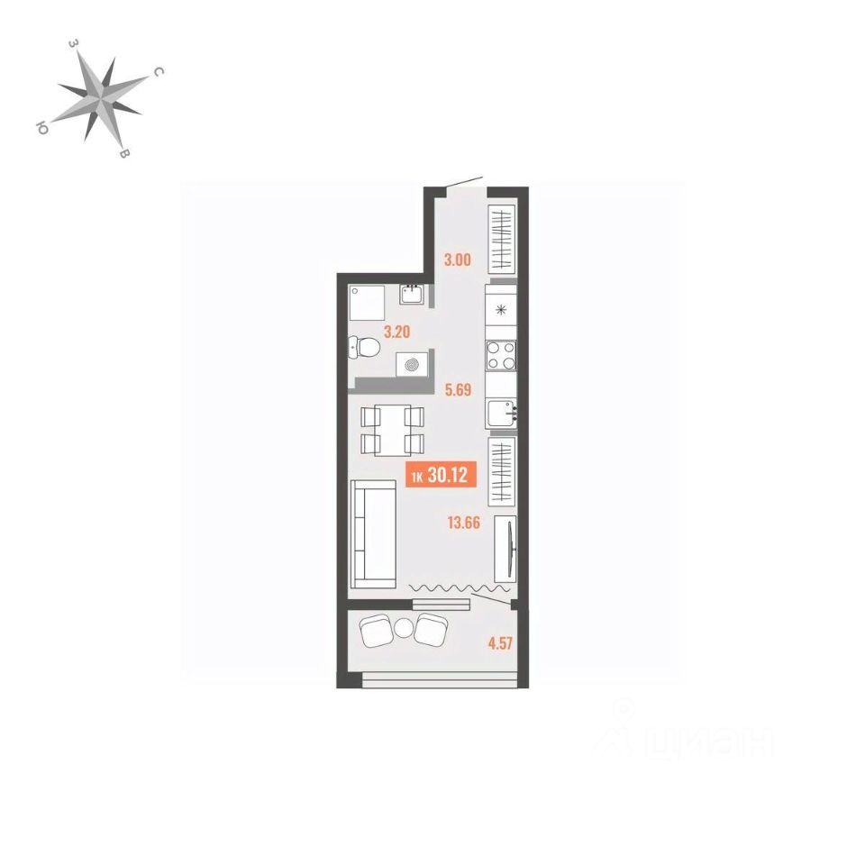 Продаётся 1-комнатная квартира в строящемся доме (Дом 1), срок сдачи: I-кв. 2028, общей площадью 30.12 кв.м., на 12 этаже. Для тех, кто строит будущее Большого Камня