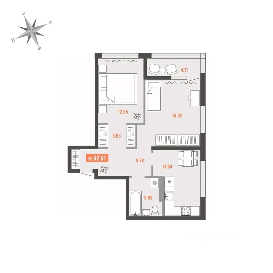 Продаётся 2-комнатная квартира в строящемся доме (Дом 1), срок сдачи: I-кв. 2028, общей площадью 62.91 кв.м., на 15 этаже. Для тех, кто строит будущее Большого Камня
