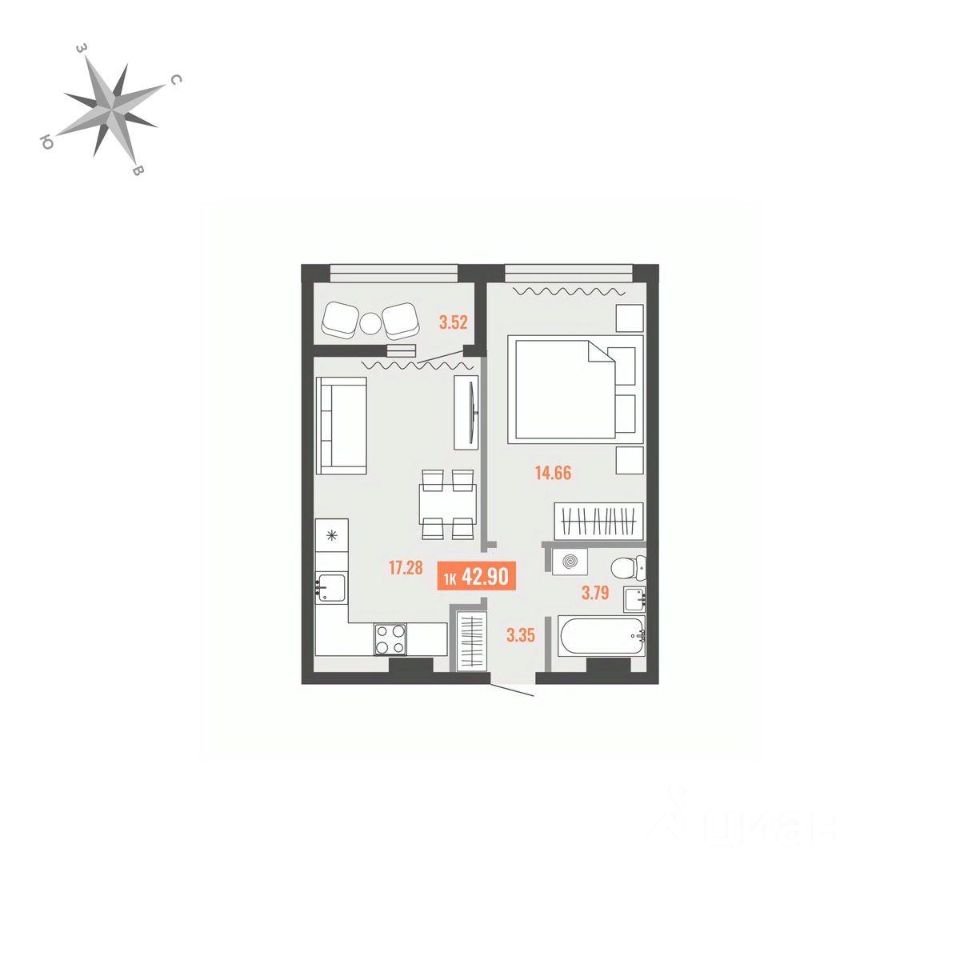 Продаётся 1-комнатная квартира в строящемся доме (Дом 1), срок сдачи: I-кв. 2028, общей площадью 42.9 кв.м., на 2 этаже. Для тех, кто строит будущее Большого Камня
