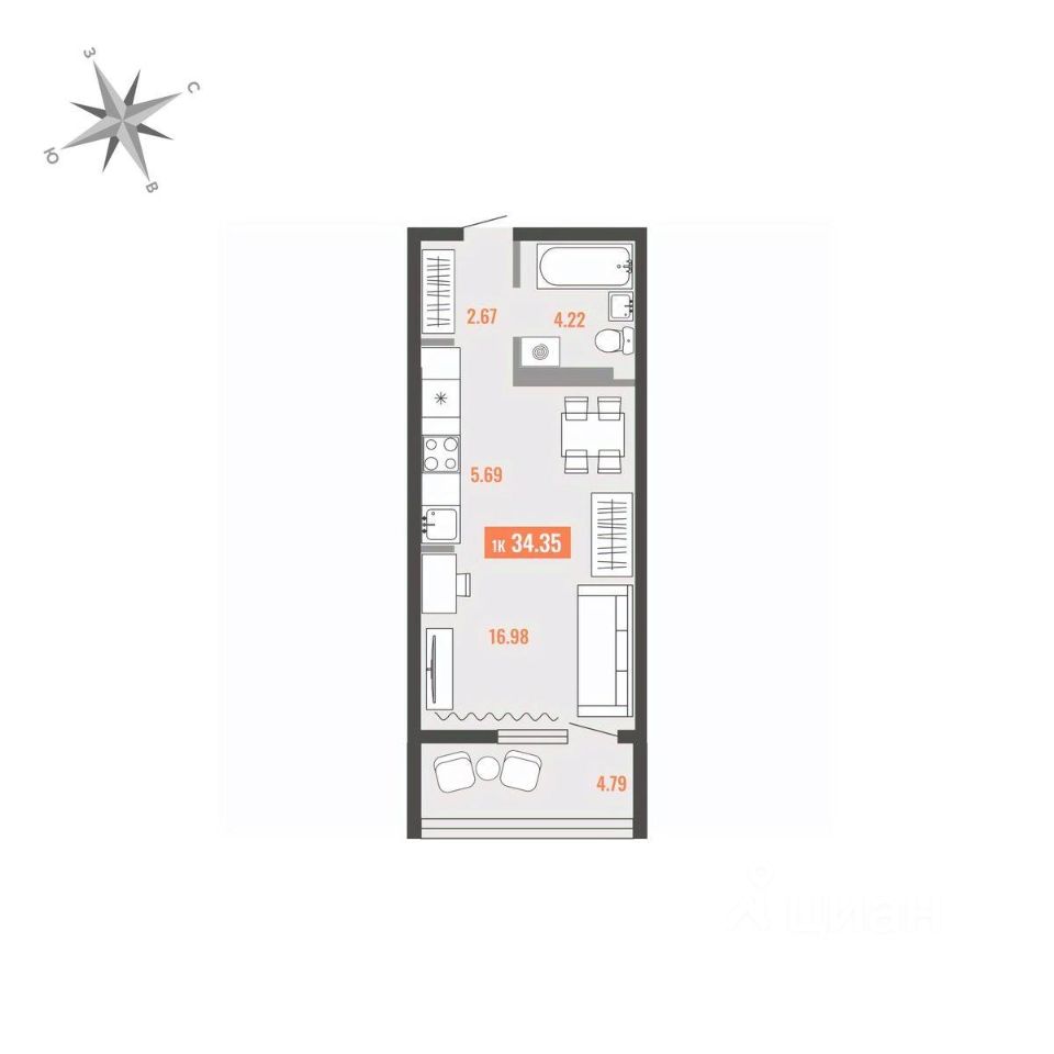 Общая площадь34,35 м²