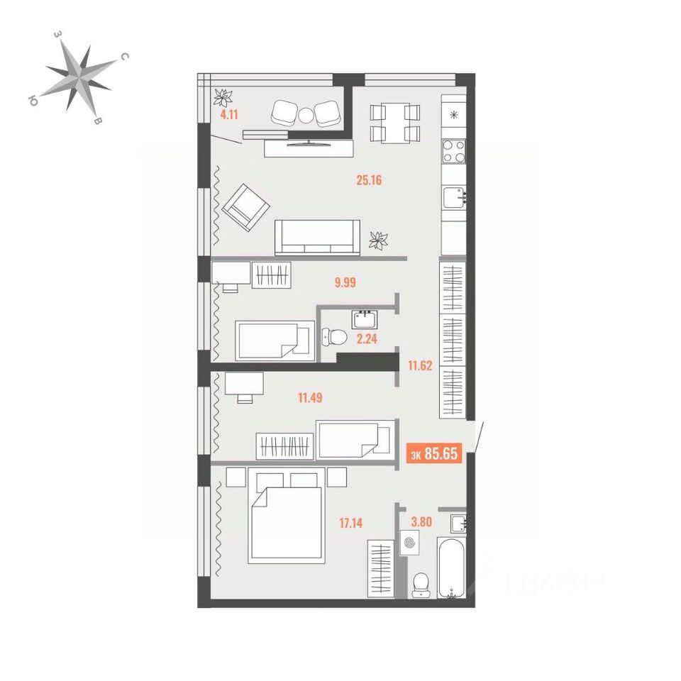 Продаётся 3-комнатная квартира в строящемся доме (Дом 1), срок сдачи: I-кв. 2028, общей площадью 85.65 кв.м., на 6 этаже. Для тех, кто строит будущее Большого Камня
