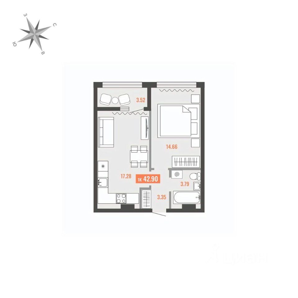 Продаётся 1-комнатная квартира в строящемся доме (Дом 1), срок сдачи: I-кв. 2028, общей площадью 42.9 кв.м., на 6 этаже. Для тех, кто строит будущее Большого Камня