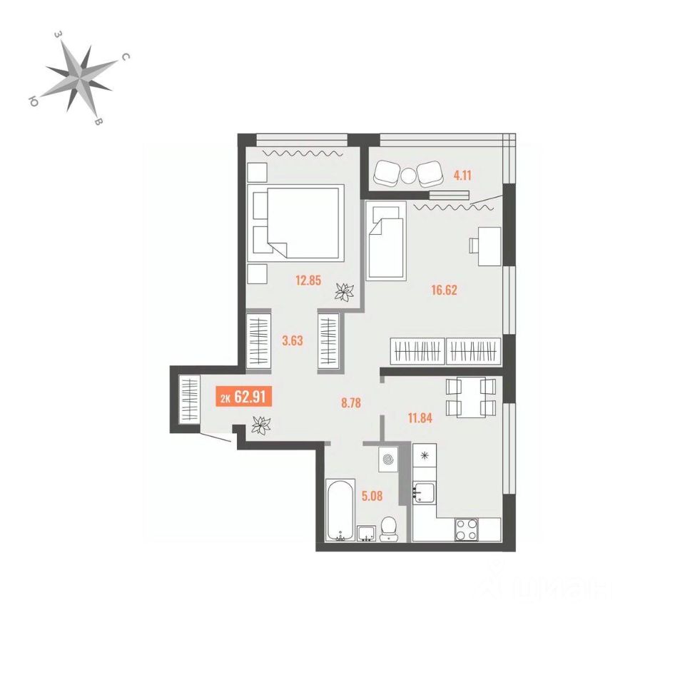 Продаётся 2-комнатная квартира в строящемся доме (Дом 1), срок сдачи: I-кв. 2028, общей площадью 62.91 кв.м., на 6 этаже. Для тех, кто строит будущее Большого Камня