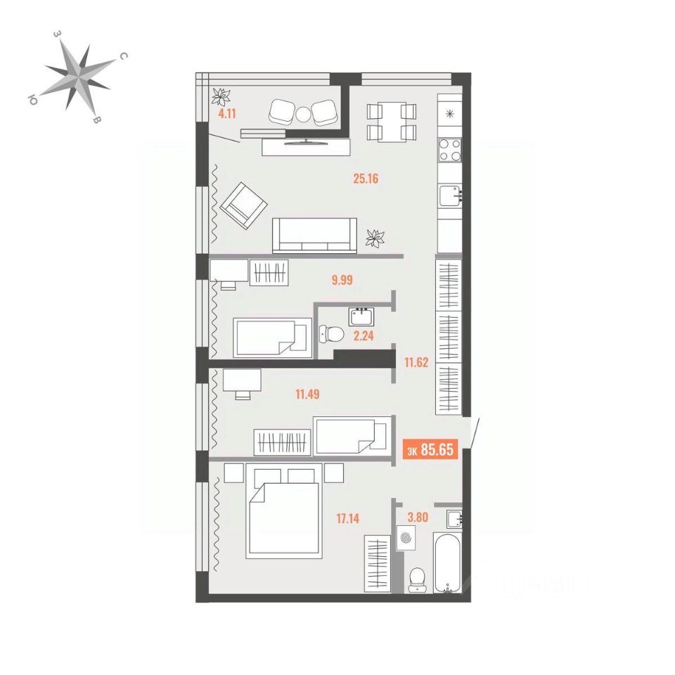Продаётся 3-комнатная квартира в строящемся доме (Дом 1), срок сдачи: I-кв. 2028, общей площадью 85.65 кв.м., на 1 этаже. Для тех, кто строит будущее Большого Камня