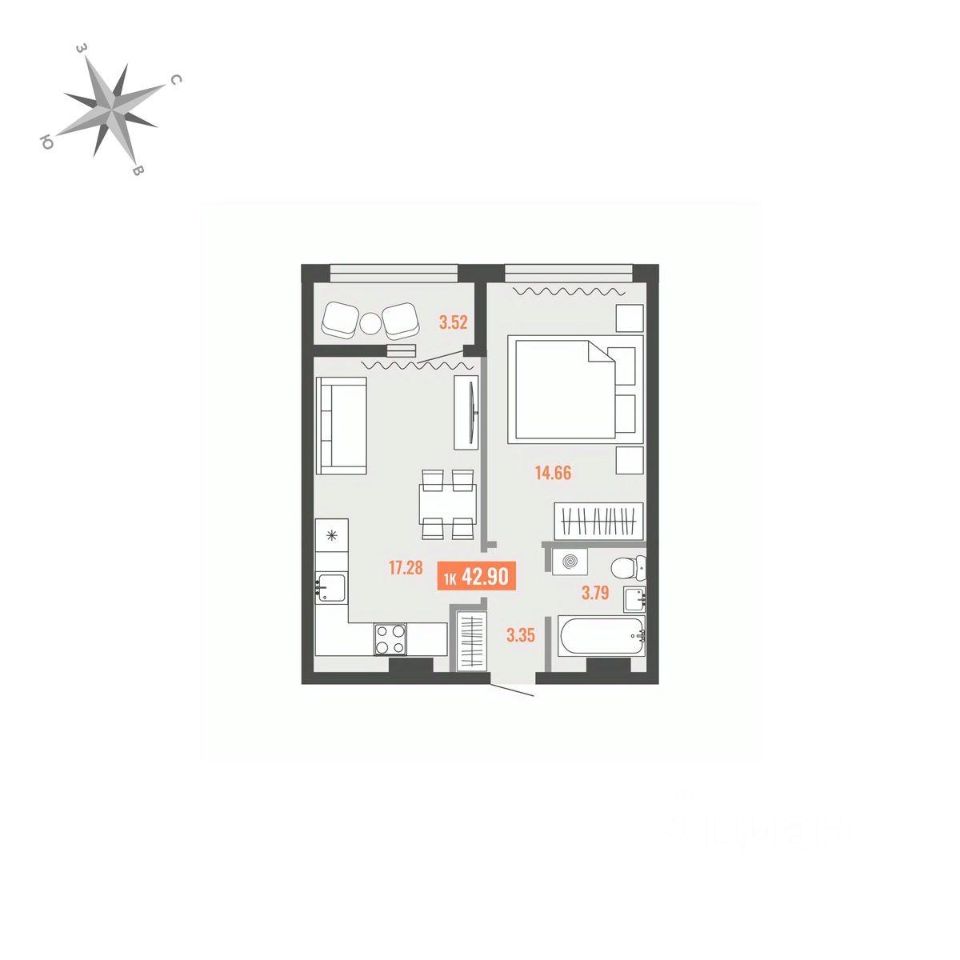 Продаётся 1-комнатная квартира в строящемся доме (Дом 1), срок сдачи: I-кв. 2028, общей площадью 42.9 кв.м., на 9 этаже. Для тех, кто строит будущее Большого Камня