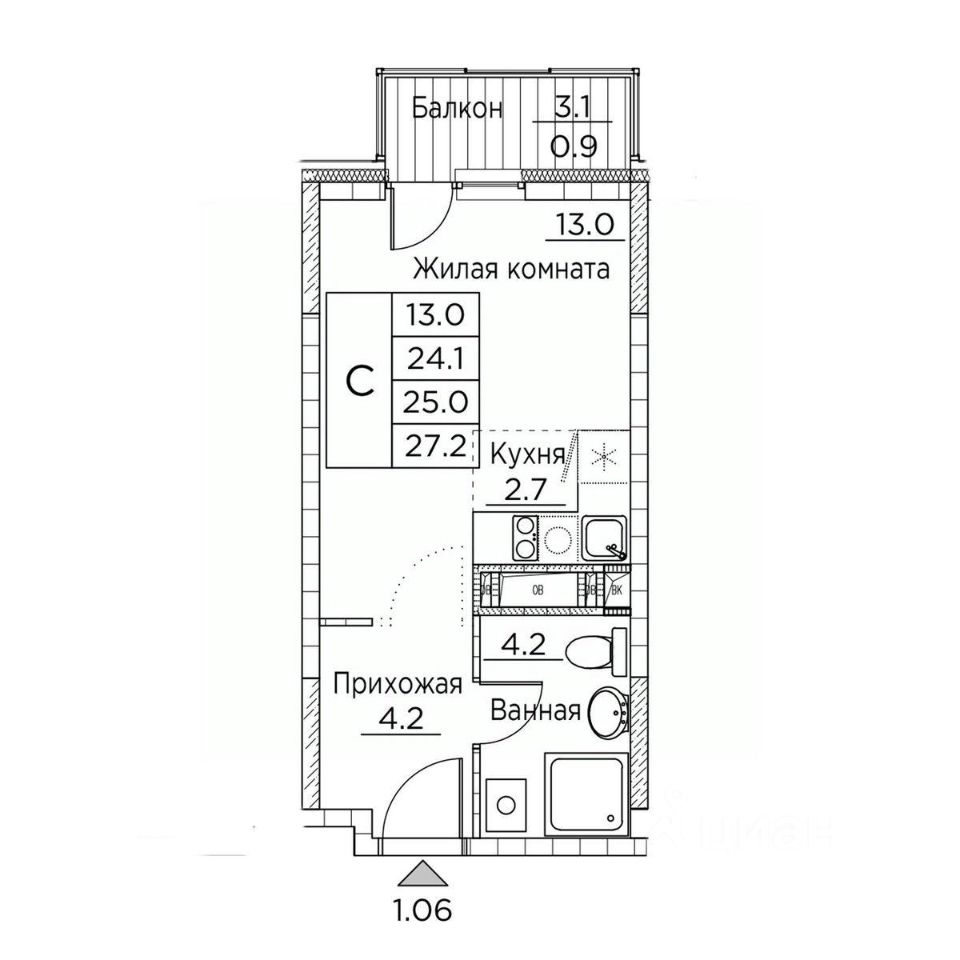 Общая площадь квартиры — 27.2 кв. м, этаж 12 из 20.