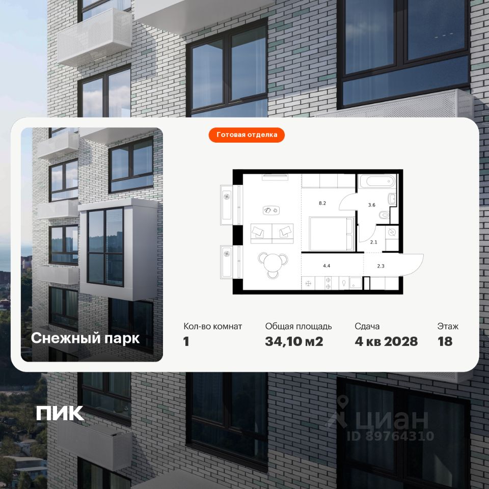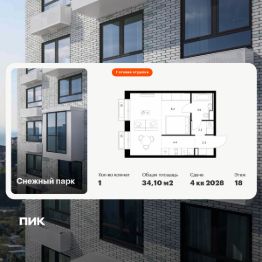 Продаётся 1-комн. квартира площадью 34,1 кв.м на 11 этаже 25 этажного дома (Корпус 4, Секция 2) проекта ПИК Снежный парк. Светлый просторный подъезд на уровне земли, функциональная планировка, большие окна, c отделкой.