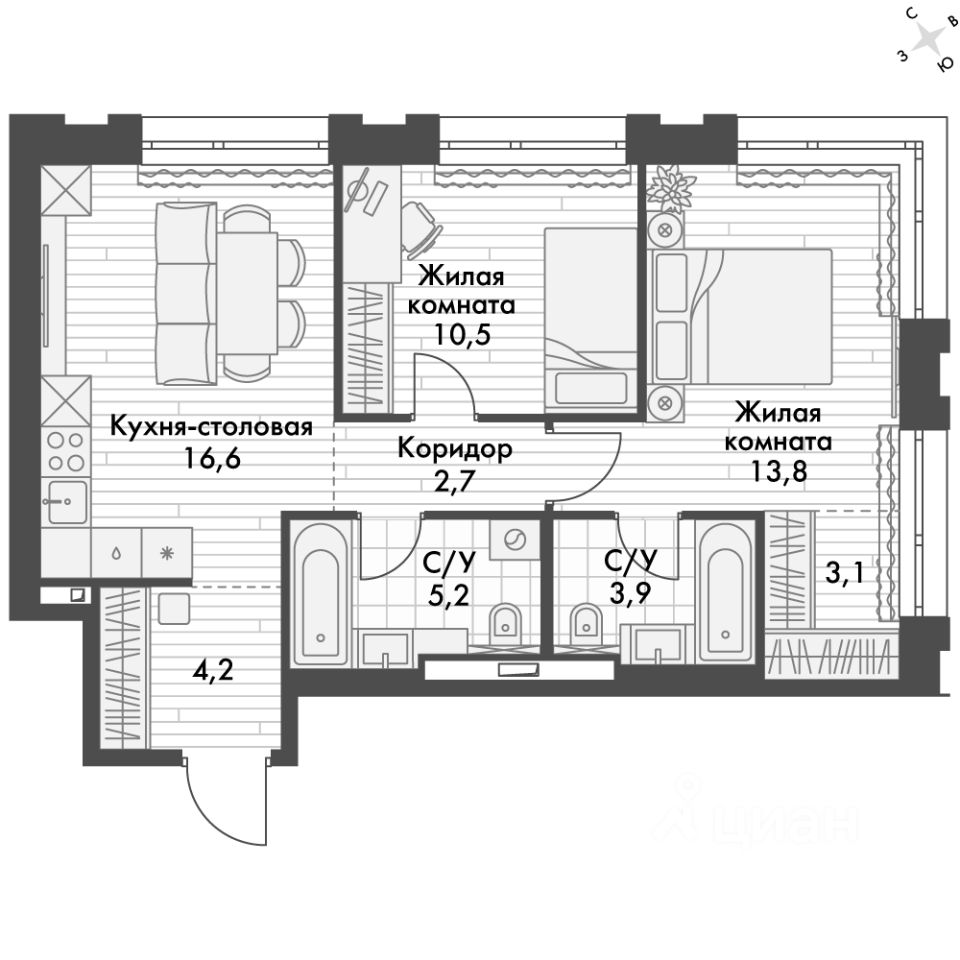 - Мастер-зона с санузлом и гардеробной. Всё для вашего комфорта и удобства, включая личный санузел и гардероб.