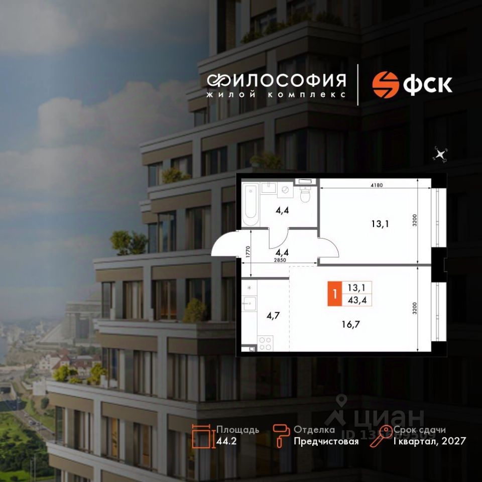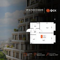 Продаётся 1-к квартира номер 226 общей площадью 44.2 кв.м. на 2-м этаже 23 этажного здания. Предчистовая отделка. Цена с учётом скидки.