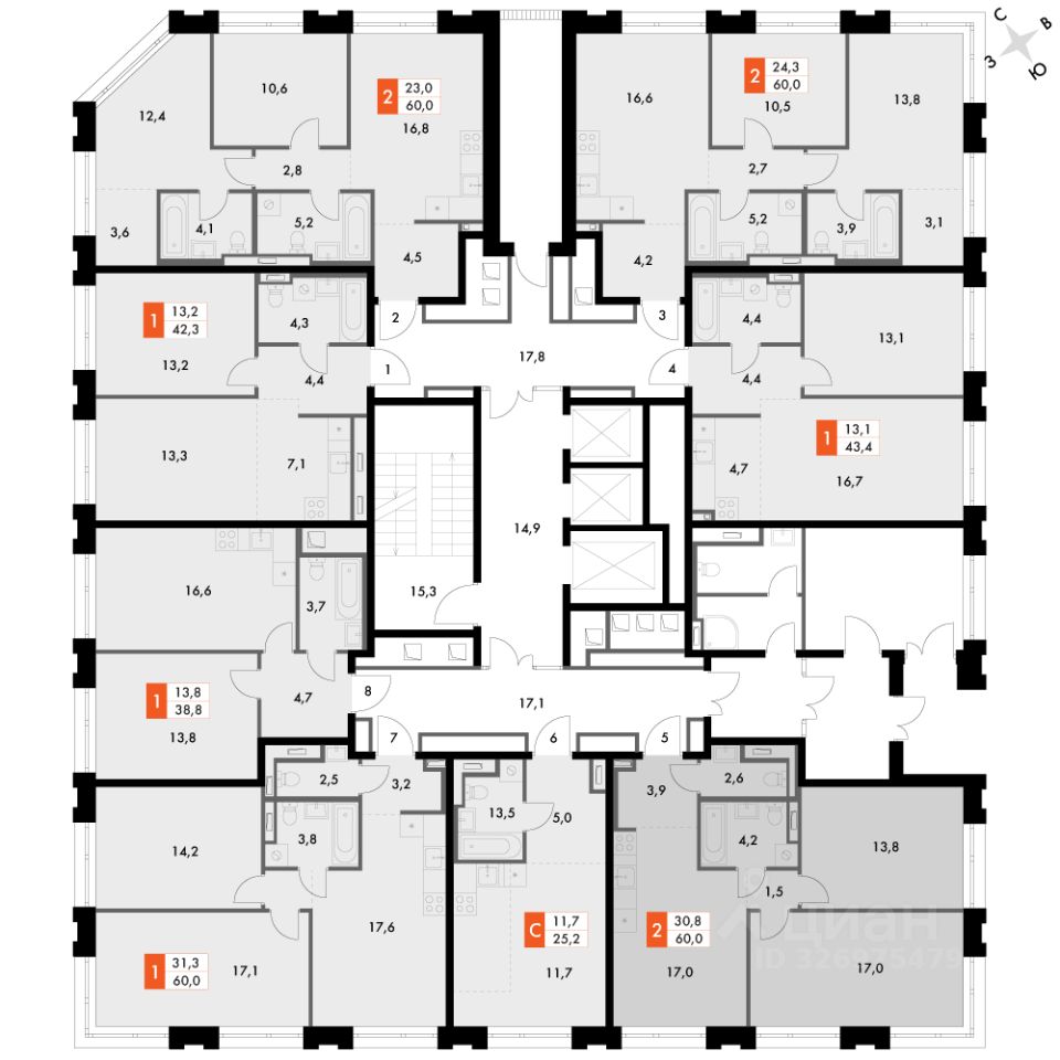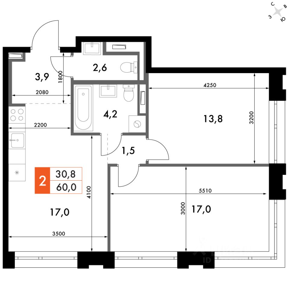 Продаётся 2-к квартира номер 227 общей площадью 57.6 кв.м. на 2-м этаже 23 этажного здания. Отделка Whitebox. Цена с учётом скидки.