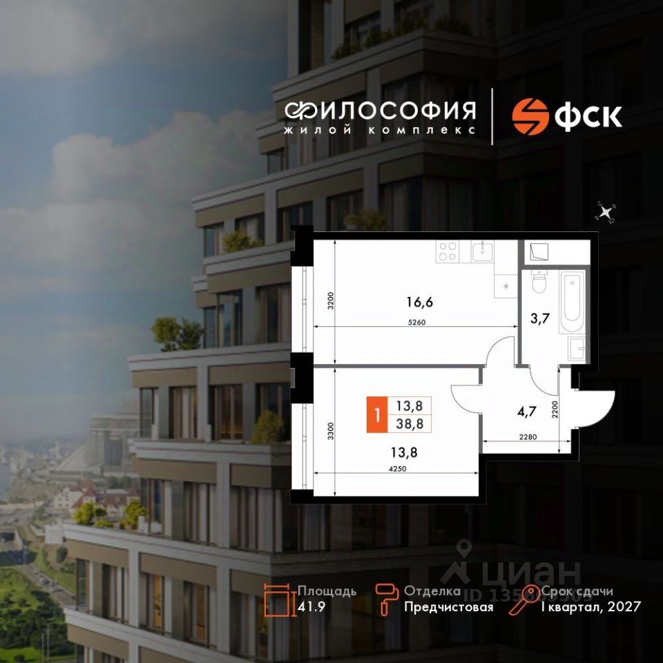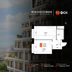 Продаётся 1-к квартира номер 230 общей площадью 41.9 кв.м. на 2-м этаже 23 этажного здания. Предчистовая отделка. Цена с учётом скидки.