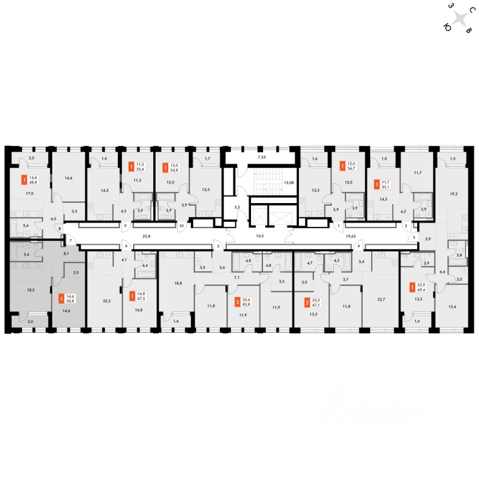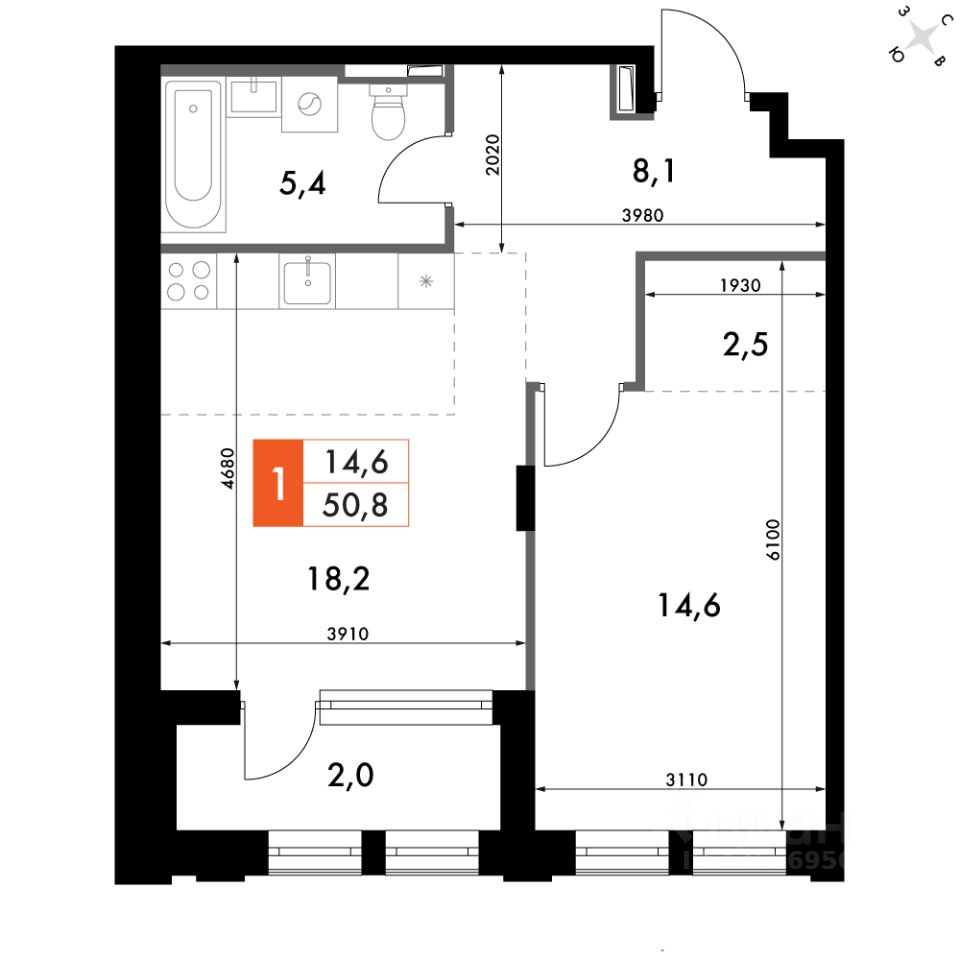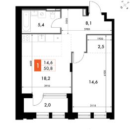 Продаётся 1-к квартира номер 181 общей площадью 51.2 кв.м. на 8-м этаже 14 этажного здания. Отделка Whitebox. Цена с учётом скидки.