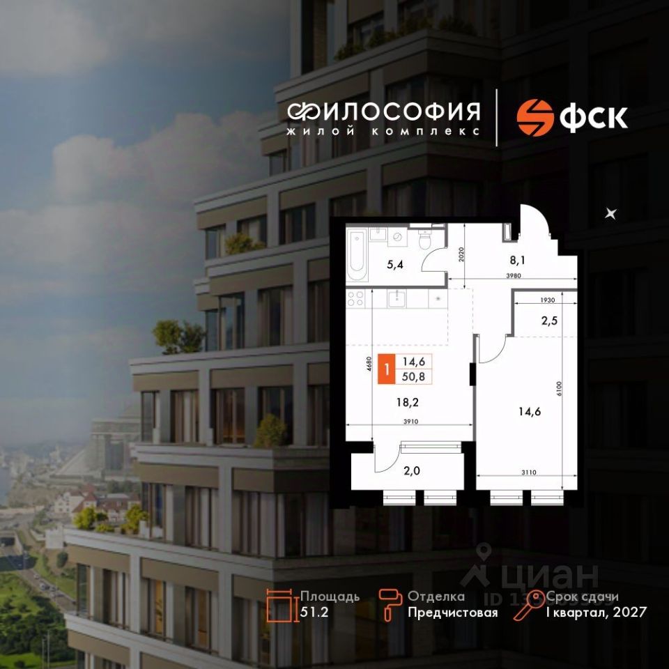 Продаётся 1-к квартира номер 181 общей площадью 51.2 кв.м. на 8-м этаже 14 этажного здания. Предчистовая отделка. Цена с учётом скидки.