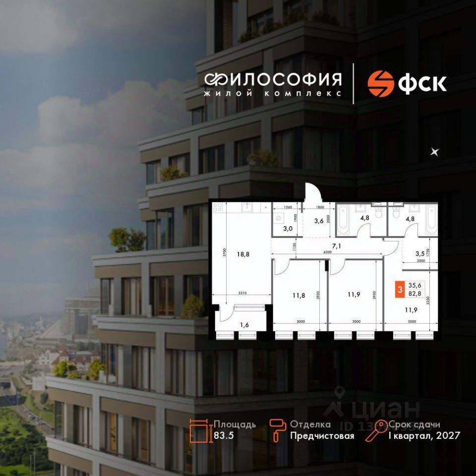 Продаётся 3-к квартира номер 129 общей площадью 83.5 кв.м. на 3-м этаже 14 этажного здания. Предчистовая отделка. Цена с учётом скидки.