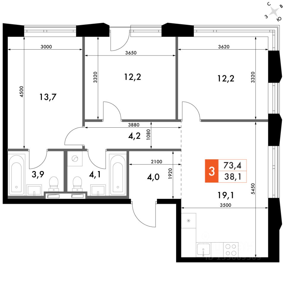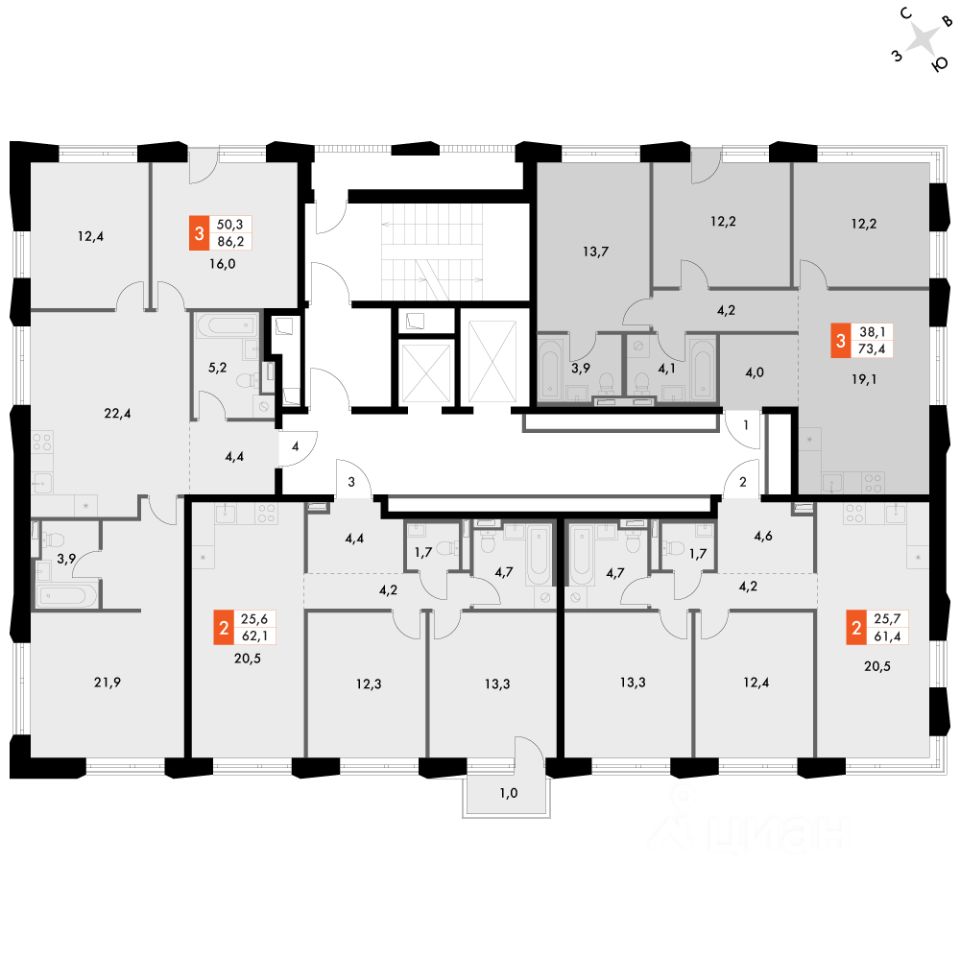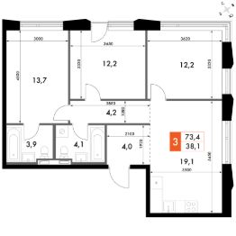 Продаётся 3-к квартира номер 414 общей площадью 72.8 кв.м. на 5-м этаже 10 этажного здания. Отделка Whitebox. Цена с учётом скидки.