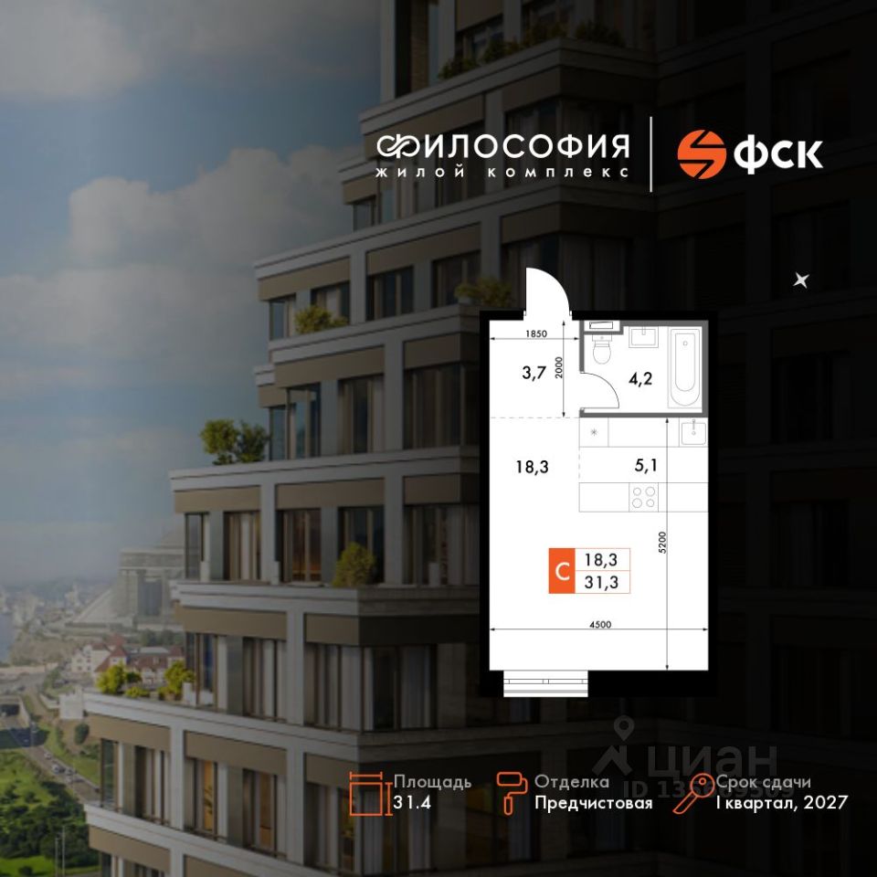 Продаётся квартира-студия номер 74 общей площадью 31.4 кв.м. на 9-м этаже 14 этажного здания. Предчистовая отделка. Цена с учётом скидки.