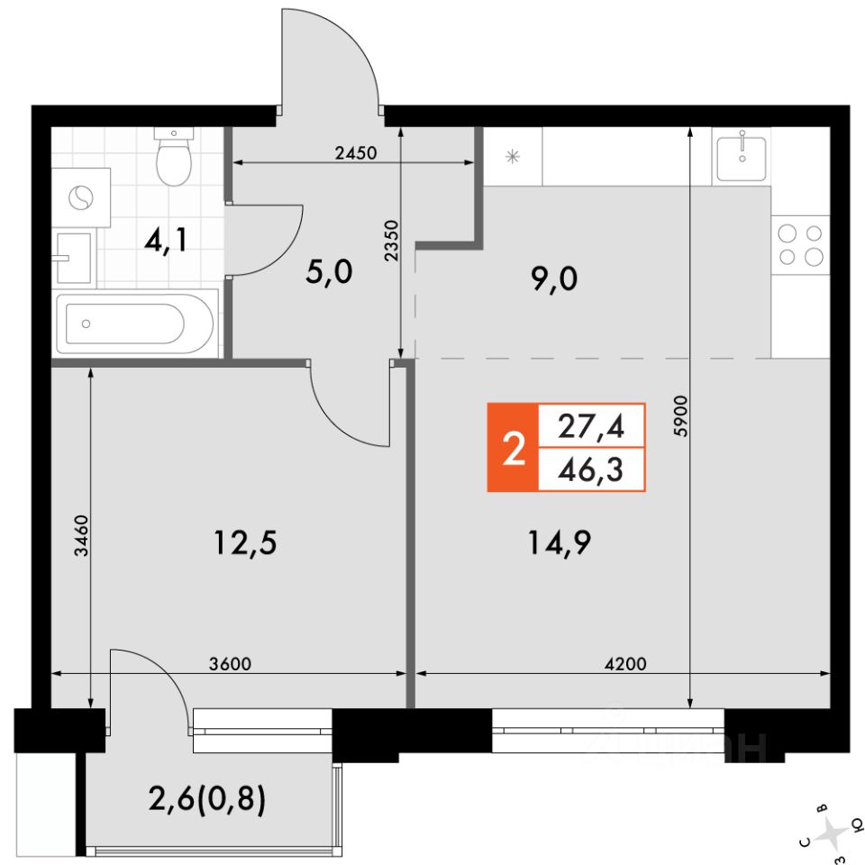 Продаётся 2-к квартира номер 609 общей площадью 46.3 кв.м. на 10-м этаже 12 этажного здания. Отделка Whitebox. Цена с учётом скидки.