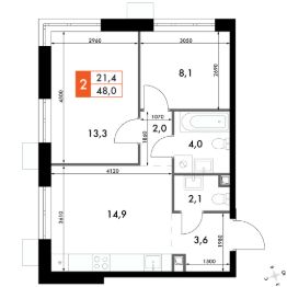 Продаётся 2-к квартира номер 390 общей площадью 48 кв.м. на 11-м этаже 22 этажного здания. Отделка Whitebox. Цена с учётом скидки.