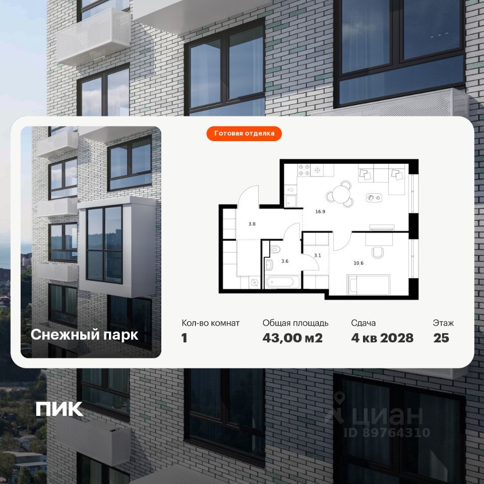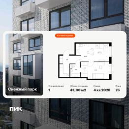Продаётся 1-комн. квартира площадью 43 кв.м на 18 этаже 25 этажного дома (Корпус 4, Секция 2) проекта ПИК Снежный парк. Светлый просторный подъезд на уровне земли, функциональная планировка, большие окна, c отделкой.