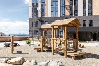 Комфортному пребыванию во дворе уделено также много внимания, как и проживанию в квартире. Детские и спортивные площадки, зоны отдыха располагаются как на стилобатной части между корпусами, так и на парковой территории рядом с комплексом. Проектом предусмотрено комплексное благоустройство и озеленение территории жилого комплекса.