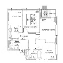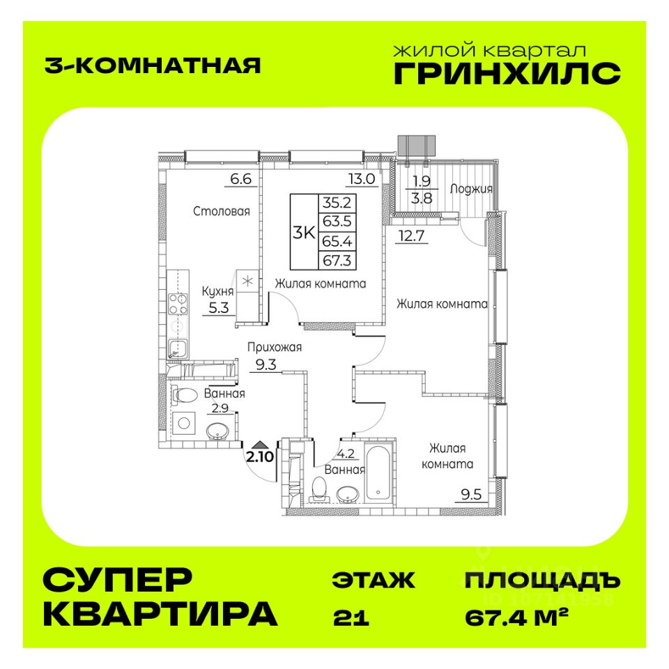 Общая площадь квартиры — 67.4 кв. м, этаж 21 из 23.