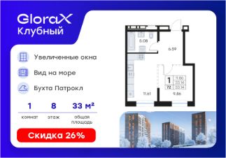 Продается 1-комн. квартира на 8-м этаже в квартале GloraX Клубный. GloraX Клубный - уникальный видовой проект с выделяющейся архитектурой в развитом районе Владивостока. Общая площадь лота составляет 33,14 кв. м, из которых 9,86 кв. м отведено под жилую и 11,61 кв. м под кухонную зону. Номер квартиры - 72.