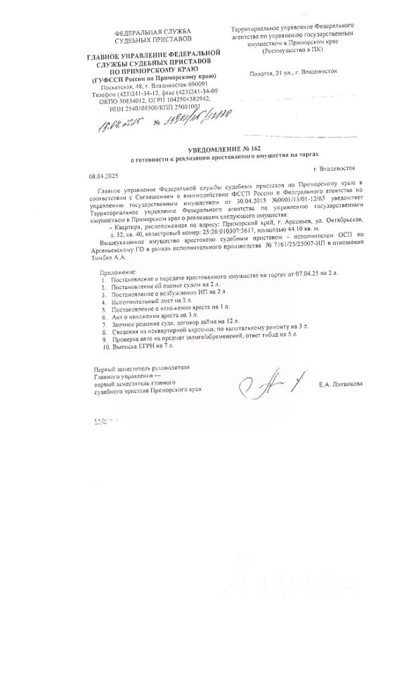 Жилое помещение (квартира) площадью 44,10 кв.м., кадастровый номер 25:26:010307:3617, расположенное по адресу: Приморский край, г. Арсеньев, ул. Октябрьская, д. 32, кв. 40. Вид права - собственность, сведения о правах и ограничениях (обременениях): 4 записи о запрещении регистрации, арест, ипотека в силу закона от 24.07.2017, по адресу зарегистрирован 1 чел., задолженность по взносам на кап.ремонт по состоянию на 28.11.2025г составляет 20683,80 руб., а также пени в размере 5546,19 руб.