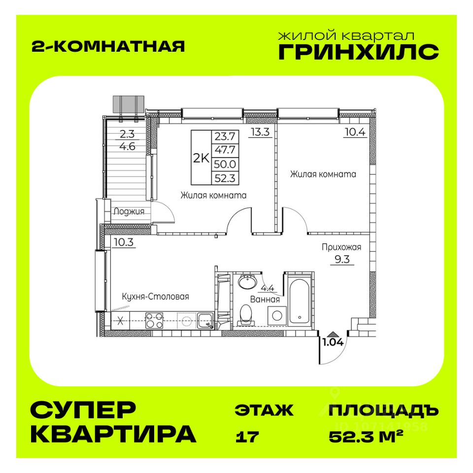Общая площадь квартиры — 52.3 кв. м, этаж 17 из 22.