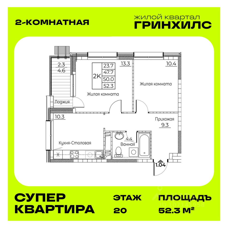 Общая площадь квартиры — 52.3 кв. м, этаж 20 из 22.