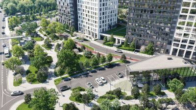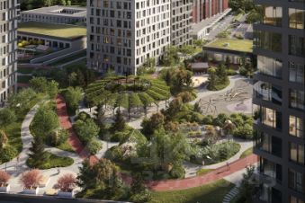 приватное благоустроенное пространство без машин для отдыха на внутренней стилобатной части комплекса с прогулочными зонами, детскими и спортивными площадками, куда могут попасть только жители квартала и их гости;