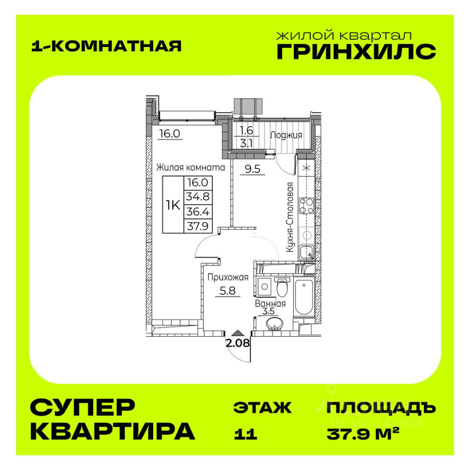 Общая площадь квартиры — 37.9 кв. м, этаж 11 из 23.