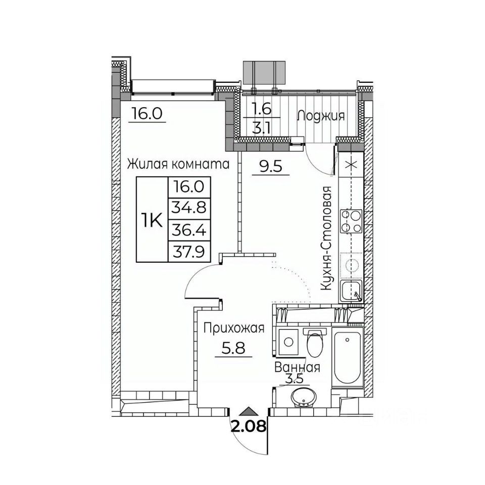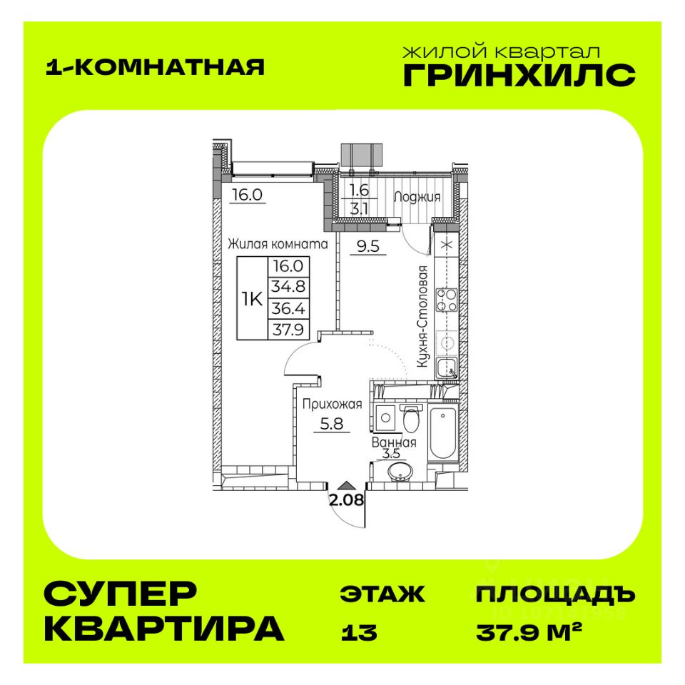 Общая площадь квартиры — 37.9 кв. м, этаж 13 из 23.