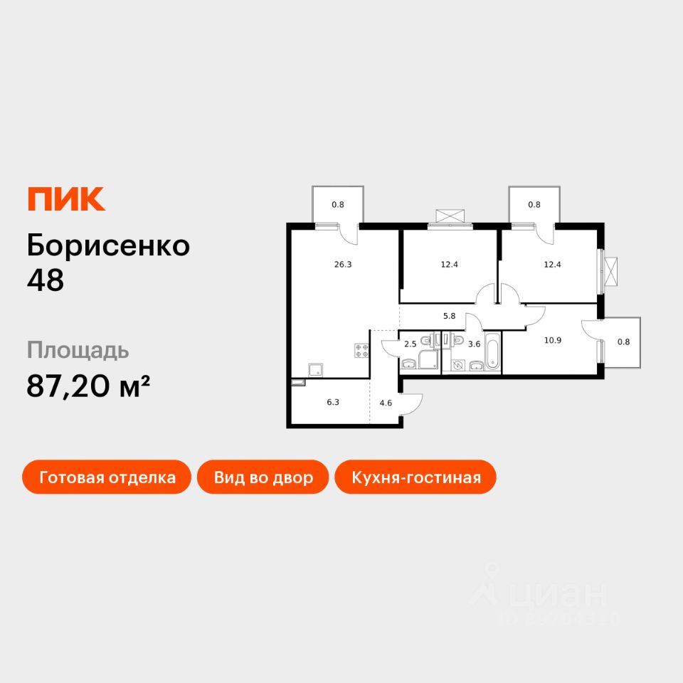 Продаётся 3-комн. квартира площадью 87,2 кв.м на 6 этаже 17 этажного дома (Корпус 1, Секция 1) проекта ПИК Борисенко 48. Светлый просторный подъезд на уровне земли, функциональная планировка, большие окна, c отделкой.