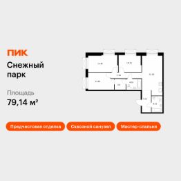 Продаётся 3-комн. квартира площадью 79,14 кв.м на 2 этаже 24 этажного дома (Корпус 1, Секция 1) проекта ПИК Снежный парк. Светлый просторный подъезд на уровне земли, функциональная планировка, большие окна, предчистовая отделка.