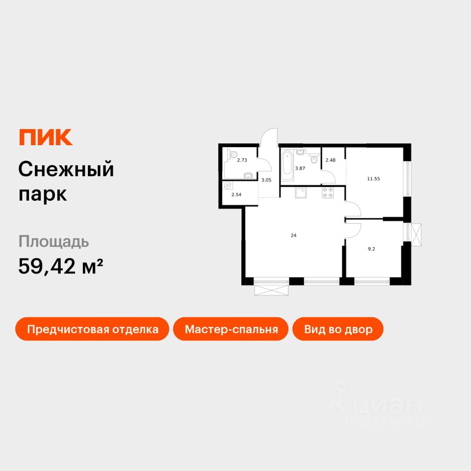 Продаётся 2-комн. квартира площадью 59,42 кв.м на 21 этаже 24 этажного дома (Корпус 2, Секция 2) проекта ПИК Снежный парк. Светлый просторный подъезд на уровне земли, функциональная планировка, большие окна, предчистовая отделка.