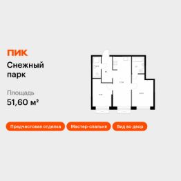 Продаётся 2-комн. квартира площадью 51,6 кв.м на 15 этаже 24 этажного дома (Корпус 2, Секция 2) проекта ПИК Снежный парк. Светлый просторный подъезд на уровне земли, функциональная планировка, большие окна, предчистовая отделка.